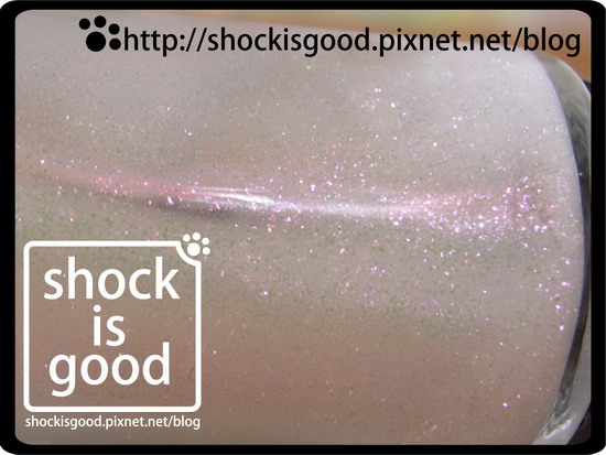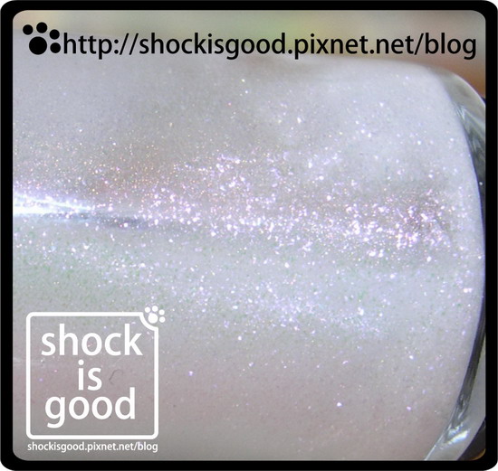 亮澤度高且帶有透明感的銀白色底色,還帶有大量桃紅色亮粉的氣質色。